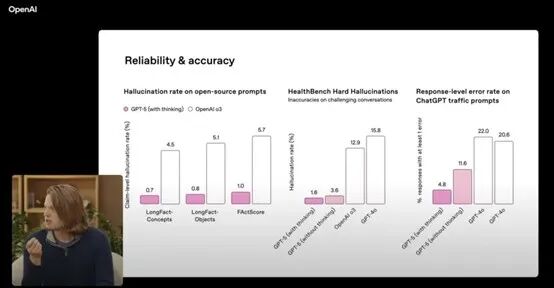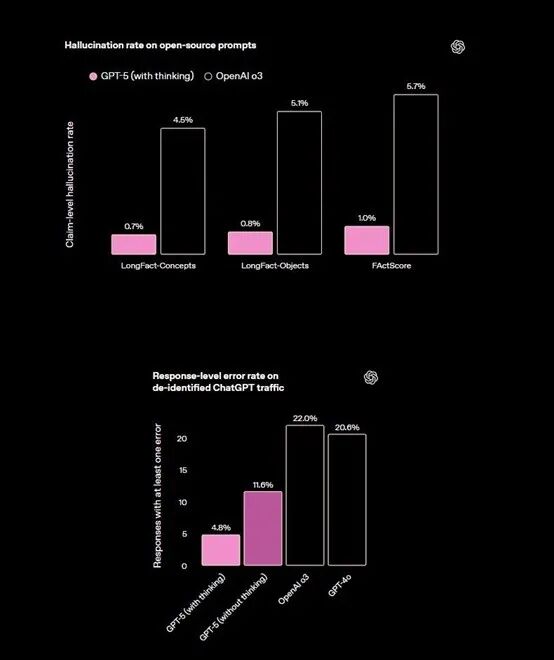 OpenAI称,GPT-5相比此前的模型更可靠和实用,它能更准确地回答现实世界的问题,出现幻觉的可能性显著降低。